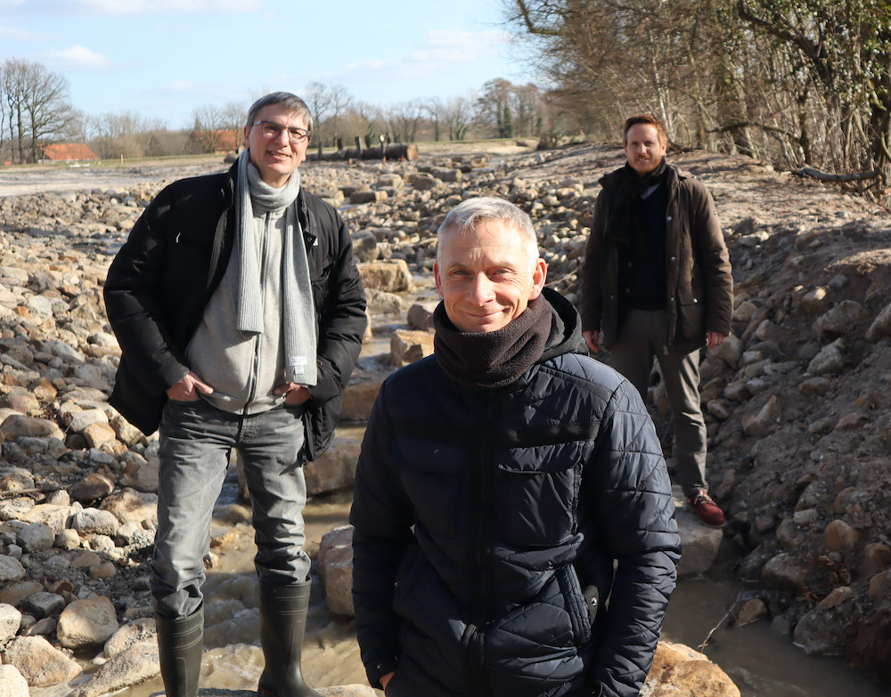 Nach viermonatiger Bauzeit freuen sich Stefan Sibilski (Sachgebietsleiter Kultur- und Wasserbau), Projektleiter Oliver Juhnke (Abteilung Tiefbau) und Henrik Egeler (Leiter der Abteilung Tiefbau) über den erfolgreichen Probedurchlauf im neuen Bachbett. Fotos: Kreis Gütersloh