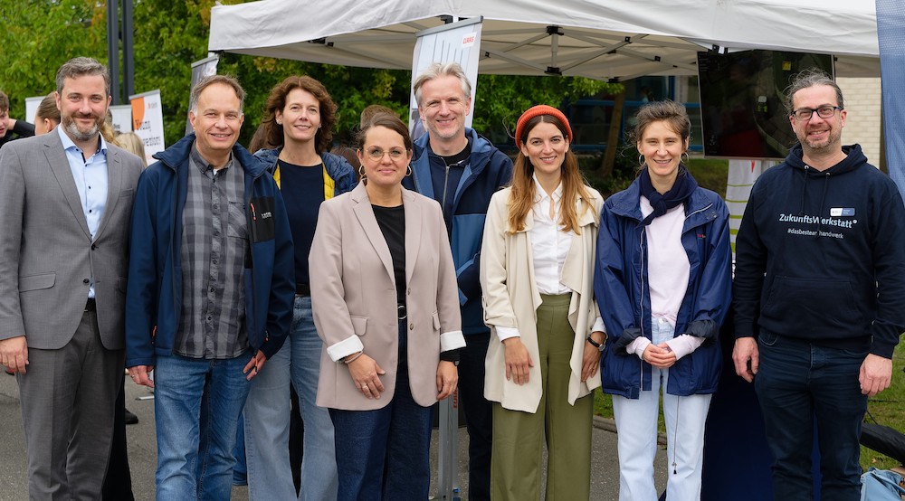 Bürgermeister Marco Diethelm, Holger Dunker (VZG), Vera Schuster (Agentur für Arbeit), Melanie Tomasiewicz (VZG) Bodo Venker (IHK), Maike-Selina Wittop (Kreishandwerkerschaft), Jenny Nikoubashman (Kreis Gütersloh) und Christian Zweig (Kreishandwerkerschaft) bei der Info- und Mitmachaktion zur Berufsorientierung auf dem Schulhof der Von-Zumbusch-Gesamtschule in Herzebrock-Clarholz.