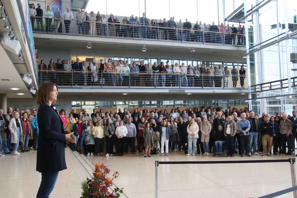Landrätin Ina Laukötter begrüßt im Foyer des Kreishauses Gütersloh die Mitarbeitenden von Kreisverwaltung, Polizei und pro Wirtschaft GT. Foto: Kreis Gütersloh