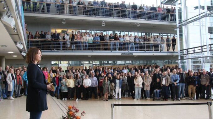 Landrätin Ina Laukötter begrüßt im Foyer des Kreishauses Gütersloh die Mitarbeitenden von Kreisverwaltung, Polizei und pro Wirtschaft GT. Foto: Kreis Gütersloh