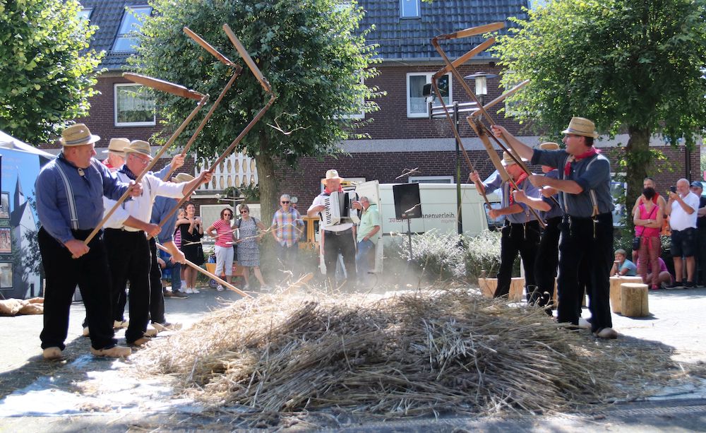 Der Kartoffelmarkt in Borgholzhausen ist seit fast 40 Jahren eine Erfolgsgeschichte. Das historische Dreschen mit musikalischer Akkordeon-Begleitung ist von Beginn an einer der Höhepunkte des traditionellen Kartoffelmarktes. Foto: Johannes Gerhards