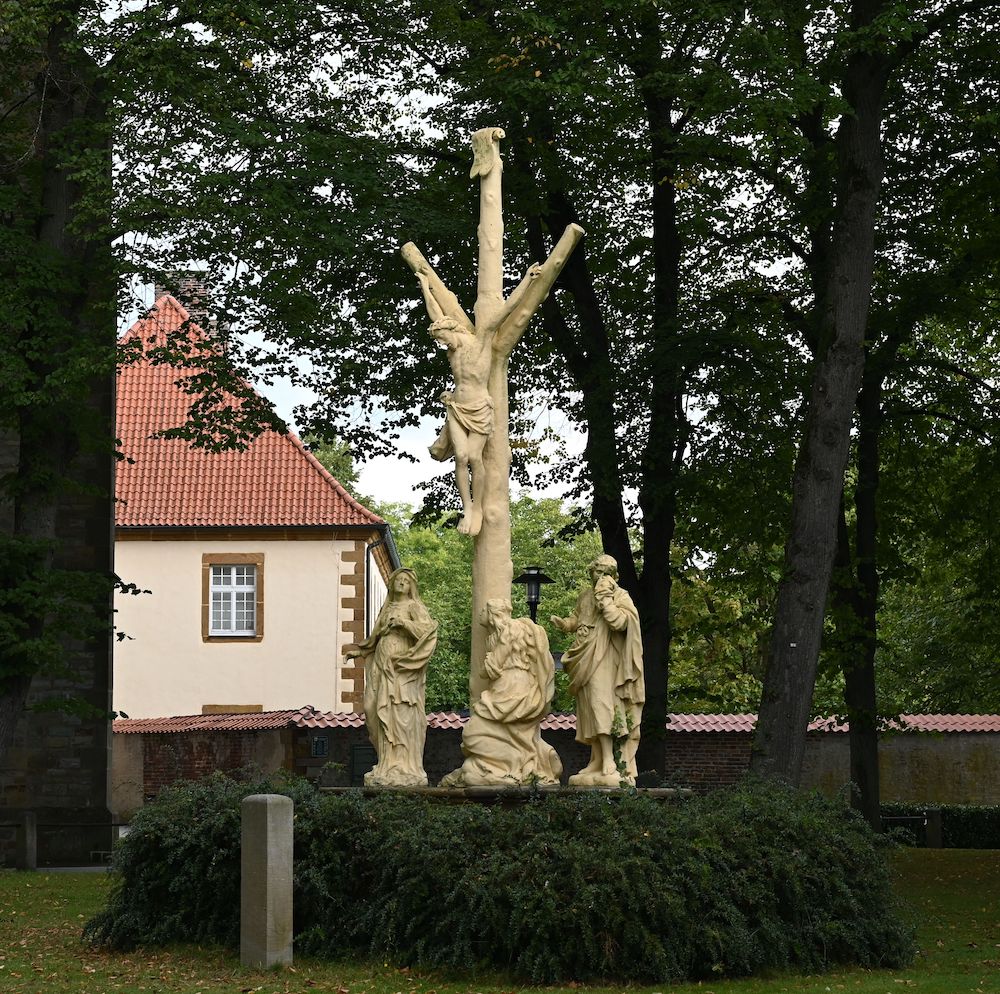Die Kreuzigungsgruppe auf dem Kirchplatz in Herzebrock ist eine der Skulpturen, der sich ein Beitrag des Jahrbuches widmet. Foto: Jan Althöfer