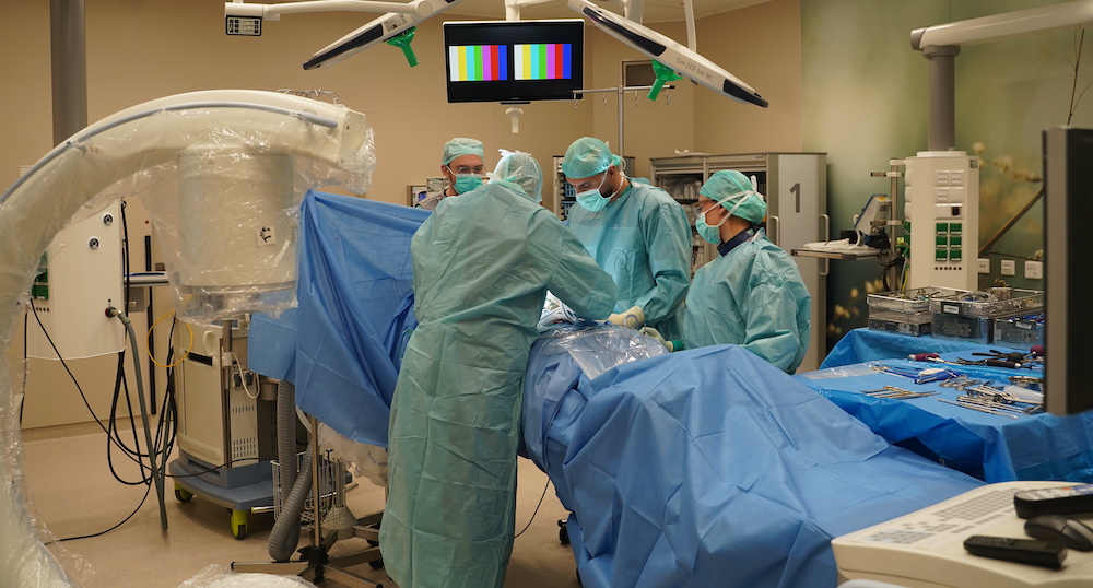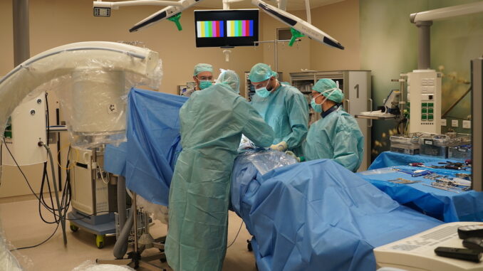 Durch optimierte Abläufe wie eine zentrale Einleitung und einen Sterilflur, in dem die OP-Tische bereits für die nächste OP vorbereitet werden können, rechnet das OP-Management mit bis zu 100 Minuten Zeitgewinn täglich. Die Echtzeit-Bildgebung während der Operation verbessert die Sicherheit für Operateur und Patient. Der OP-Bereich ist das Herzstück eines jeden Krankenhauses und gleichzeitig ein neuralgischer Punkt. Je besser die Arbeitsabläufe im OP organisiert sind und je besser Chirurgen, Pflegekräfte und Anästhesisten zusammenarbeiten können, desto besser werden auch die Patienten versorgt. Zu einer guten Organisation gehört, dass es genug Zeit für geplante Operationen gibt und auch ein Notfall nicht den gesamten Tagesplan gefährdet. Der OP ist einer der teuersten Bereiche des Krankenhauses, deshalb reduziert jeder Zeitgewinn auch die Kosten deutlich. „Egal ob Anästhesiepflegekaft oder Chirurg, Mitarbeitende aus allen Berufsgruppen haben sich bei der Planung der neuen Operationssäle eingebracht und das merkt man am Ergebnis und an der Atmosphäre im OP“, erklärt Chefarzt und ärztlicher Direktor Dr. Philipp Bula. Er selbst hat in dieser Woche eine Wirbelsäulenfraktur im neuen Operationssaal der Unfallchirurgie operiert.