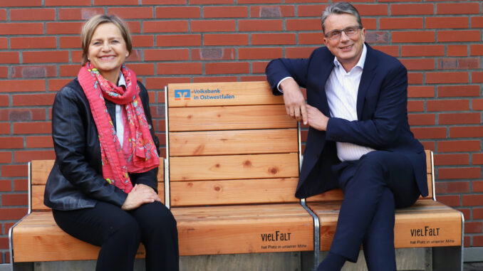 Die Wirtschaftsinitiative Kreis Gütersloh hat das Projekt ‚Vielfalts-Bank‘ gestartet, um gemeinsam mit der regionalen Wirtschaft ein klares Zeichen für Wertschätzung und gelebte Vielfalt zu setzen. Dieses Leitmotiv spiegelt sich im Design und in der Konstruktion der Sitzgelegenheit wider: Die vom Wertkreis Gütersloh gefertigte Bank besteht aus modularen Einzelelementen, die flexibel zu individuellen Sitzgruppen kombiniert werden können. Als eines der ersten Unternehmen im Kreis Gütersloh hat die Volksbank in Ostwestfalen sich dazu entschieden, mit der Bank in Gütersloh ein sichtbares Zeichen für Diversität, Inklusion und Toleranz zu setzen.