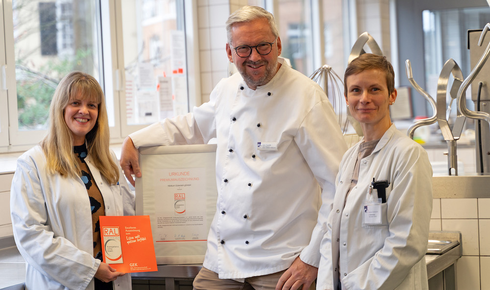 Schon seit 2007 wird die Küche im Klinikum Gütersloh regelmäßig von der Gütegemeinschaft Ernährungskompetenz mit dem RAL-Gütesiegel zertifiziert. Auch dieses Jahr vergaben die externen Gutachter die Höchstbewertung, so dass das Klinikum erneut als RAL-Premium-Betrieb ausgezeichnet wurde. Die Qualitätsvorgaben sind streng: Die Gäste müssen zum Beispiel detaillierte Informationen zu allen Gerichten, Nährwerten und Zusatzstoffen erhalten können, die Hygiene-Richtlinien müssen eingehalten werden und das Team aus diätetisch geschulten Köchen und Diätassistenten muss regelmäßig an Fachtagungen und Fortbildungen teilnehmen. „Für uns ist die Auszeichnung Bestätigung und Ansporn zugleich“, sagt Küchenchef Dirk Fenske. „Wir möchten unseren Patientinnen und Patienten nicht nur gutes, sondern auch gesundes und sicheres Essen anbieten. Dass unsere Arbeit nun erneut mit dem RAL-Gütesiegel gewürdigt wurde, freut mein gesamtes Team sehr.“