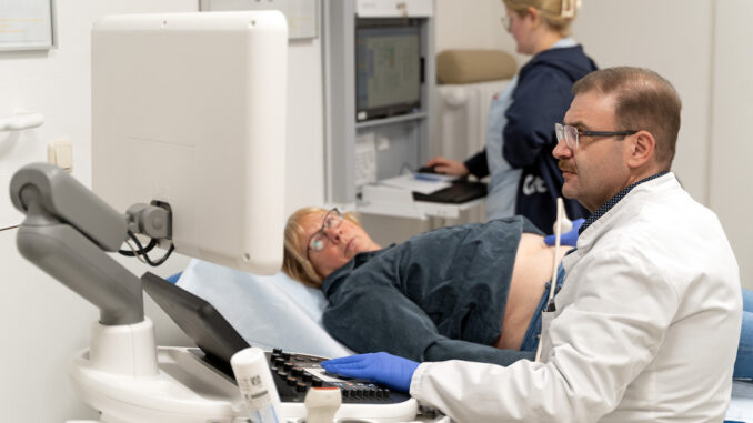 Im Rahmen des Screeningtags überprüfte Chefarzt Fahed Kazkaz auch die Bauchschlagader von Marianne Berenbrink – ohne auffälligen Befund.