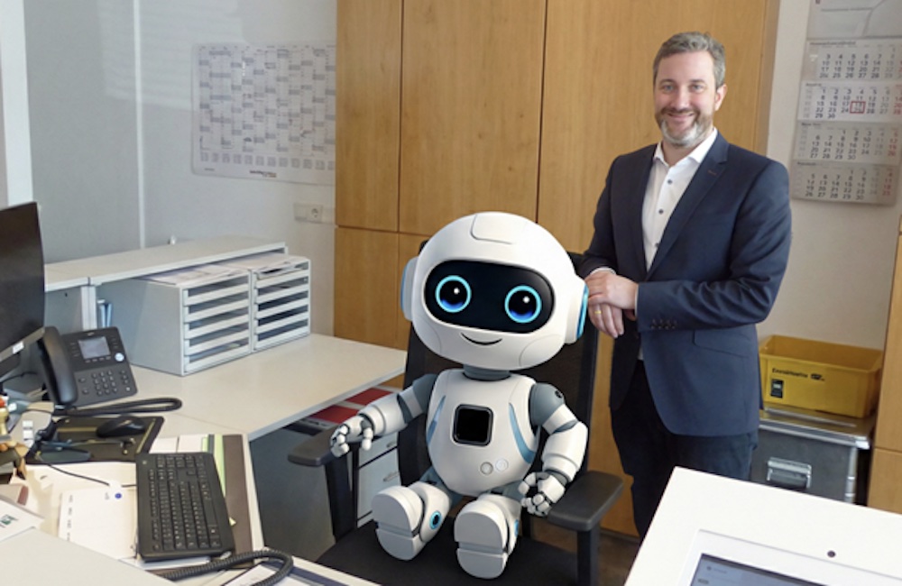 Das KI-generierte Bild zeigt Bürgermeister Marco Diethelm und den neuen Mitarbeiter „Charly“ im Bürgerservice der Gemeindeverwaltung Herzebrock-Clarholz.