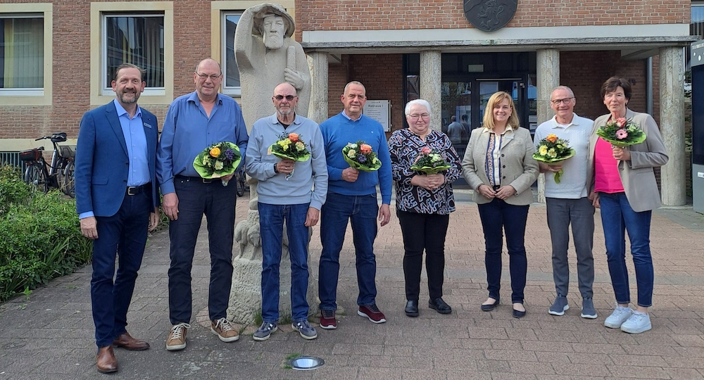 Trafen sich zur gemütlichen Feierstunde im Rathaus (v.l.): Personalchef Stefan Volmering, Horst Loddemann, Alfons Ohlmeier, Martin Poppenborg, Olga Graf, Bürgermeisterin Pamela Westmeyer, Reinhard Strotjohann und Petra Eggelbusch.