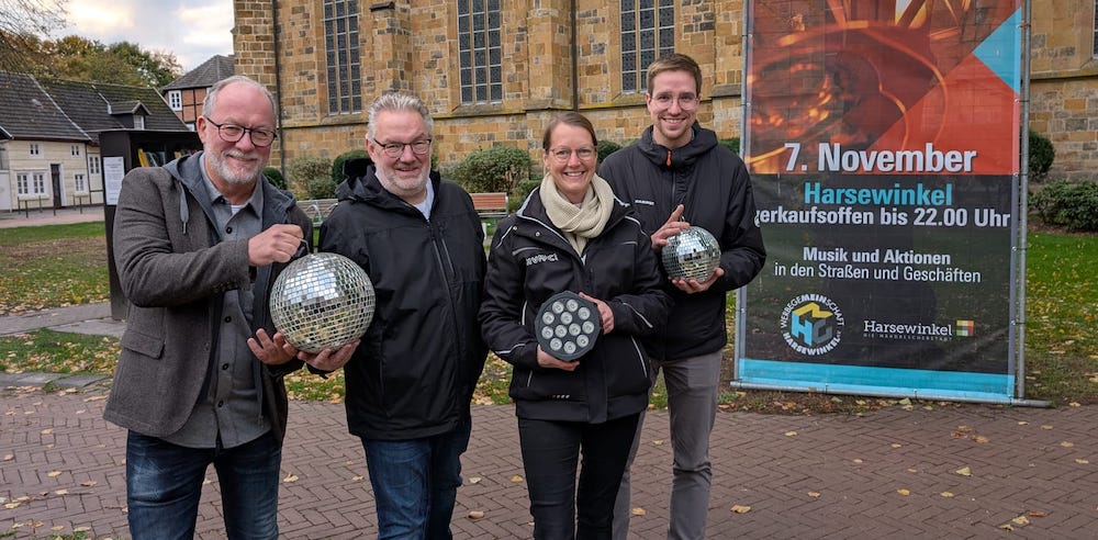 Präsentierten gemeinsam Programm und Aktionen des diesjährigen LichterAbends in der Harsewinkeler Innenstadt (v.l.): Reinhold Everding und Chris Brentrup (beide Werbegemeinschaft Harsewinkel), Simone Heitmann (HVMC Show- und Veranstaltungstechnik) sowie Robin Ossenbrink (Stadt Harsewinkel).