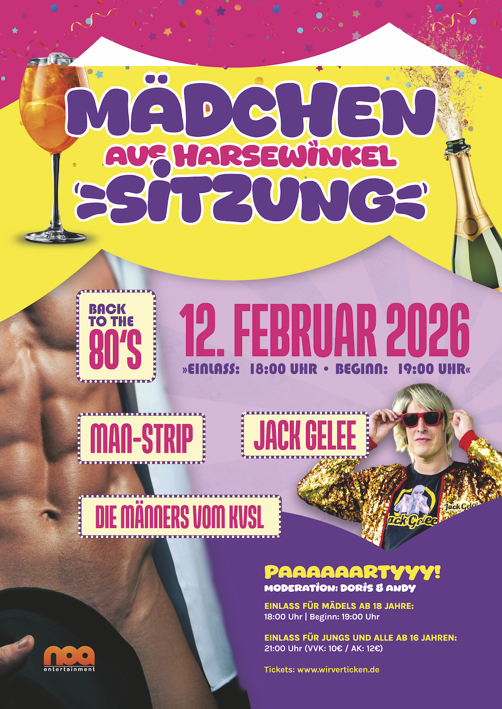 Mit dabei „Megastar“ Jack Gelee aus Hamburg, ein Käfig voller Narren, Partyspiele, Wahl zum „Mädchen Nr. 1 aus Harsewinkel 2026“ und natürlich viel nackte Männerhaut!