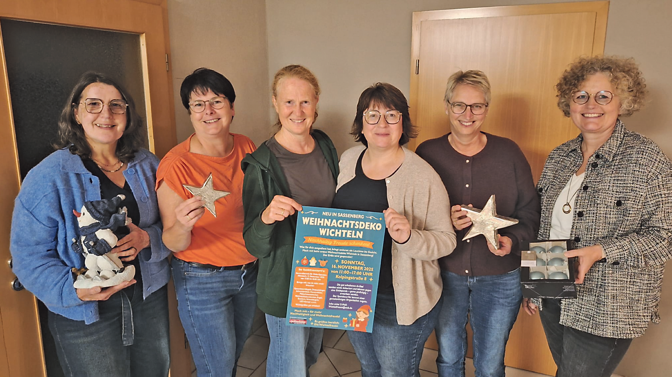 Glänzende Kugeln, funkelnde Sterne und liebevoll gearbeitete Engel – all das liegt oft gut verstaut auf dem Dachboden und findet doch keinen Platz mehr am eigenen Weihnachtsbaum. In diesem Jahr gibt es in Sassenberg eine wunderbare Gelegenheit, diese Schätze weiterzugeben und gleichzeitig Gutes zu tun: Am Sonntag, 16. November 2025, laden die „Wichtelfrauen“ von 11 bis 17 Uhr zum 1. Weihnachtsdeko-Wichteln ein. Die engagierte Frauengruppe, die bereits mit dem beliebten Frauentrödel im Ort für Aufmerksamkeit sorgte, möchte mit der neuen Aktion ein Zeichen für Nachhaltigkeit und Gemeinschaft setzen. „Was für den einen überflüssig ist, kann für jemand anderen ein echtes Highlight sein“, erklären die Wichtelfrauen. Ganz nach dem Motto: wertschätzen statt wegwerfen, Ressourcen schonen und Abfall vermeiden. Wer mitmachen möchte, kann seine gut erhaltene Advents- und Weihnachtsdekoration schon vorab in der Sammelphase am Mittwoch, 12. November 2025, von 15 bis 18 Uhr in der Kolpingstraße 8, 48336 Sassenberg abgeben. Angenommen werden zum Beispiel Tannenbaumkugeln, Adventskränze, Fensterbilder, Backformen und Plätzchenausstecher, Tischdecken, Engel, Sterne, Weihnachtsmänner, Rentiere, Schneekugeln, Weihnachtsbücher oder LED-Kerzen. Lichterketten können aus Sicherheitsgründen nicht entgegengenommen werden. Am Veranstaltungstag darf dann jede:r nach Herzenslust stöbern und sich die passenden Lieblingsstücke mit nach Hause nehmen. Eine Spendenbox steht bereit – der Erlös geht vollständig an den Schmetterlingshof Warendorf e.V., der sich für Kinder, Jugendliche und Familien in besonderen Lebenssituationen einsetzt. Wer Fragen hat, erreicht die Wichtelfrauen unter wichtelfrauen@web.de oder bei Instagram unter @wichtelfrauen_sassenberg. Die Wichtelfrauen freuen sich schon jetzt auf viele Besucher:innen und darauf, gemeinsam mit der Sassenberger Gemeinschaft ein Stück Weihnachtsfreude nachhaltig zu teilen.